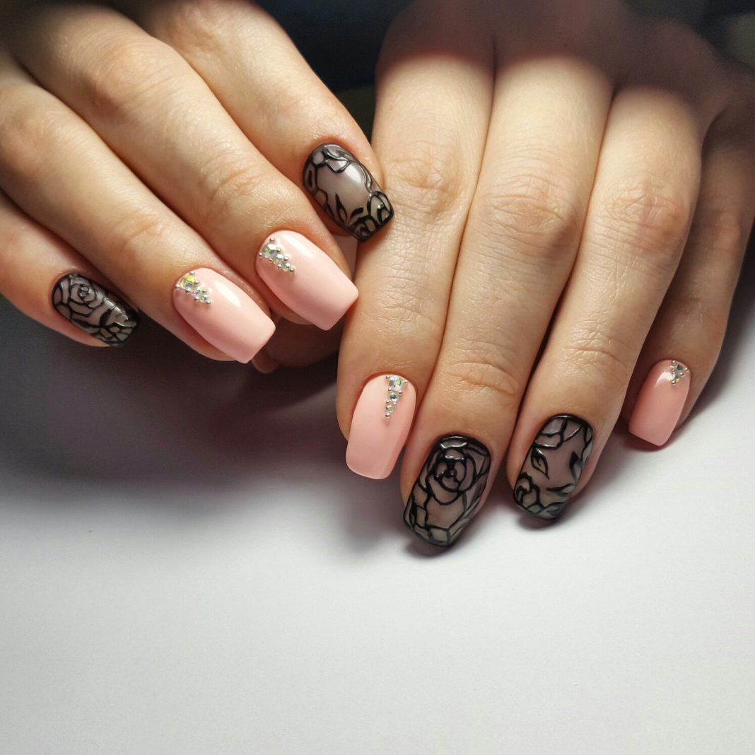 Красиво смотрится маникюр, где кружевной декор продублирован черной акриловой пудрой. Маникюр приобретает бархатность и изысканность, смотрится очень нежно и женственно. В создании вечернего маникюра с кружевом выручит стемпинг. С его помощью можно создать удивительно красивые нейл-арты за считанные минуты.