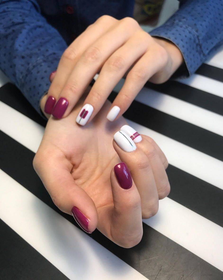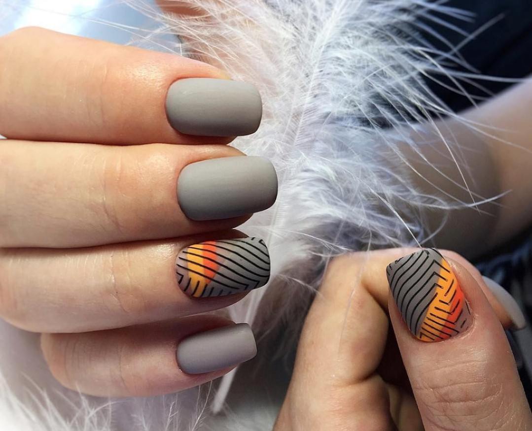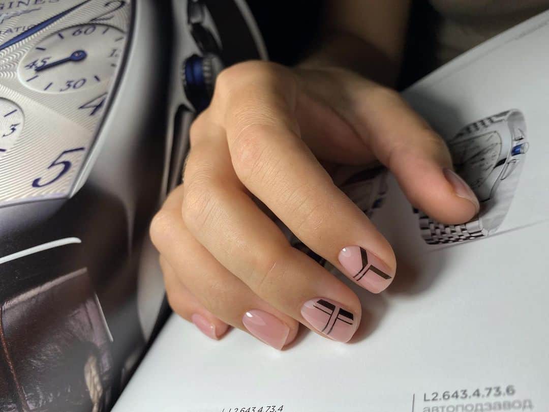 В некотором роде маникюр с геометрией можно отнести к минималистическому маникюру. Он всегда элегантный, утонченный и приятный на вид. Набор рисунков может содержать в себе любые геометрические фигуры или полоски. Цвет полосок, как и самого покрытия может быть любым.