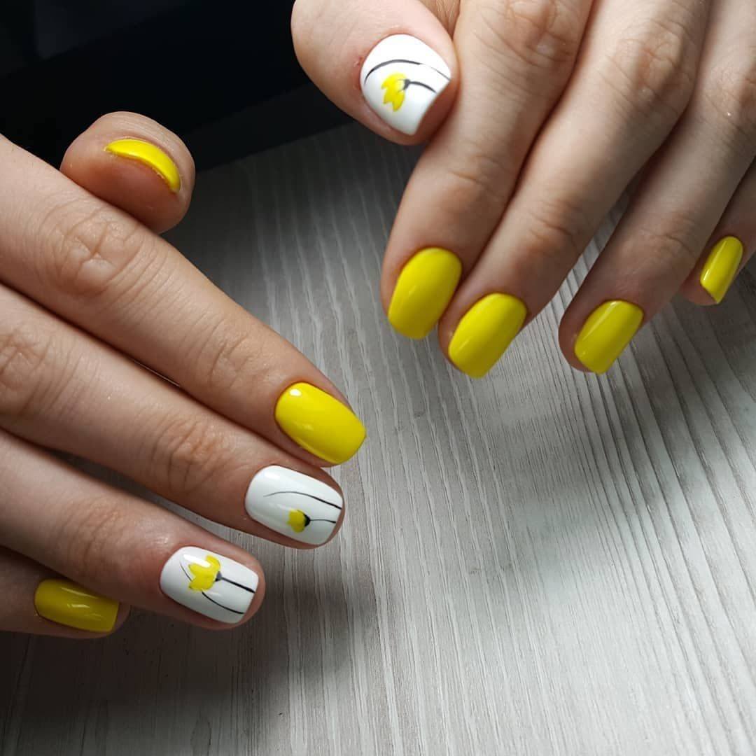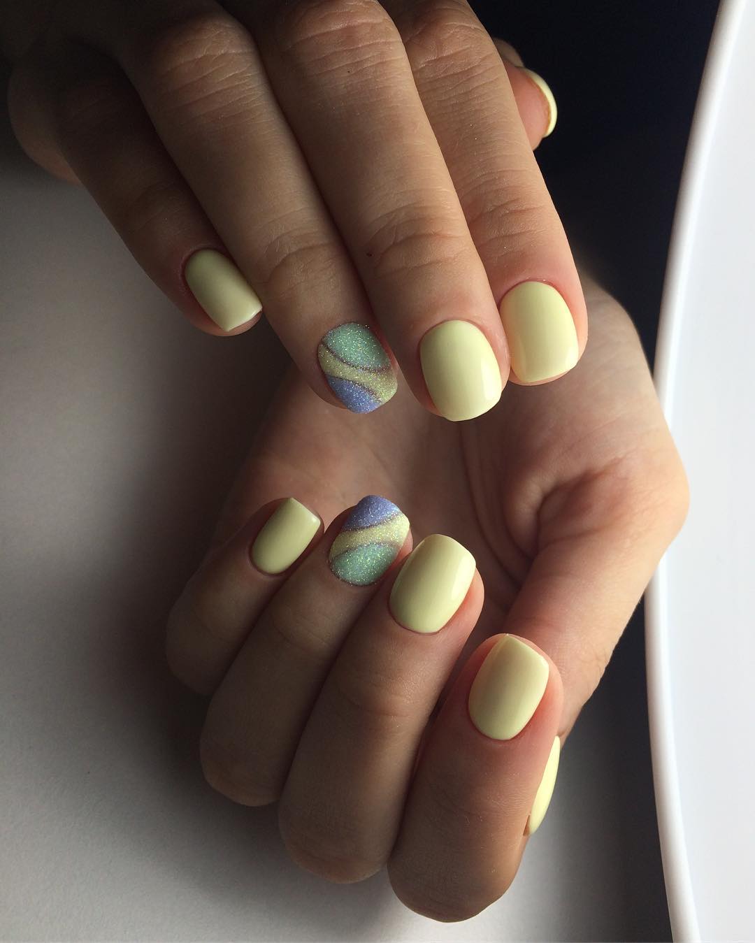 Желтый – жизнерадостный цвет, который мгновенно делает ваш образ ярче. Вы можете выбрать светлый оттенок желтого или близкий по цвету оранжевый лак, а также совместить желтый с прозрачным в виде весеннего френча.