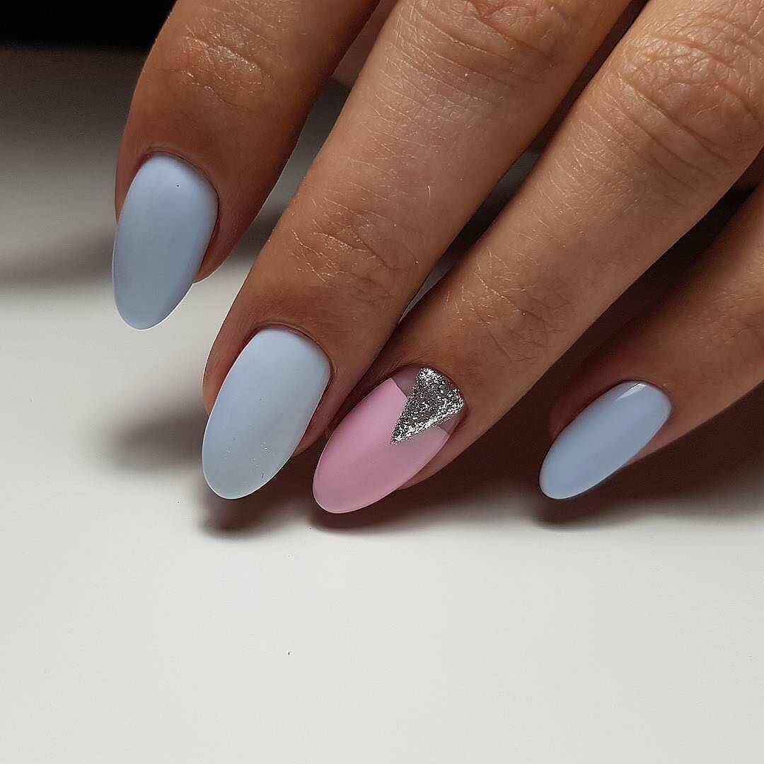небесно-голубой в сочетании со стразами и металлическими втирками, а также идеально смотрится на нарощенных ногтях;