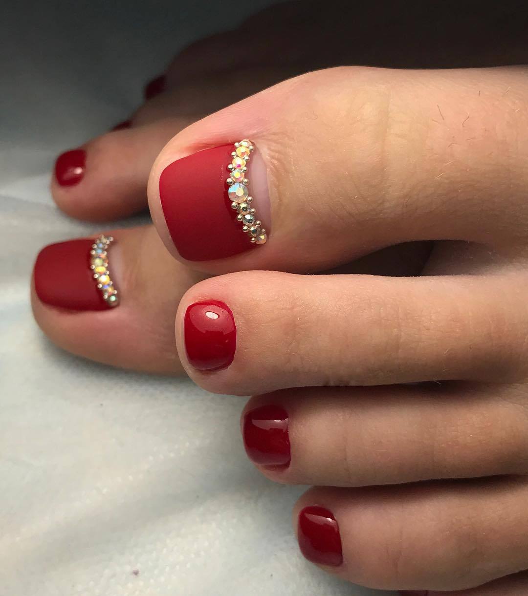 Если яркость красного цвета вас пугает, тогда попробуйте выполнить матовый красный педикюр. Он выглядит сдержанно и благородно. При этом не забудьте добавить в педикюр декор стразами, бульонками или серебряным, золотым глиттером. Однотонный матовый педикюр не приемлем, он смотрится банально и просто.