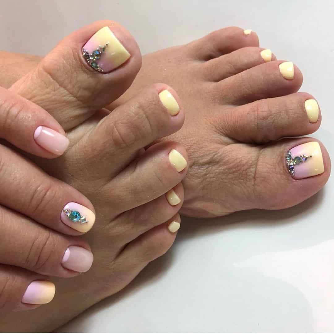 Актуальный тренд в этом сезоне – градиентный нежный педикюр, где можно сочетать от 2 до 5 оттенков, для более плавного перехода. Конечно, такое количество лаков лучше использовать на ноготке большого пальца ноги, тогда как на остальных пальчиках ногтевая пластина маленькая, и столько оттенков попросту не поместятся.