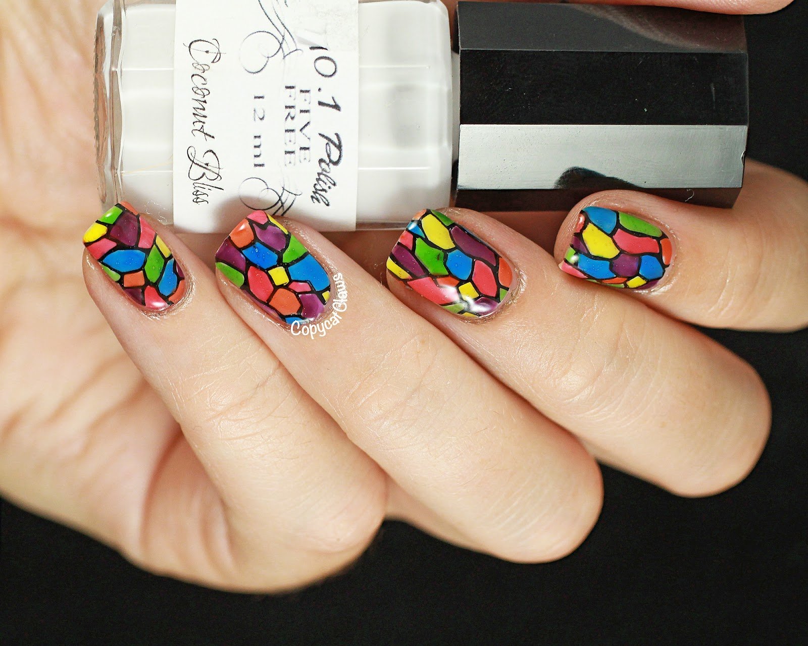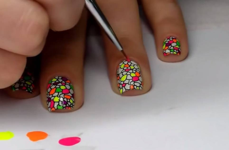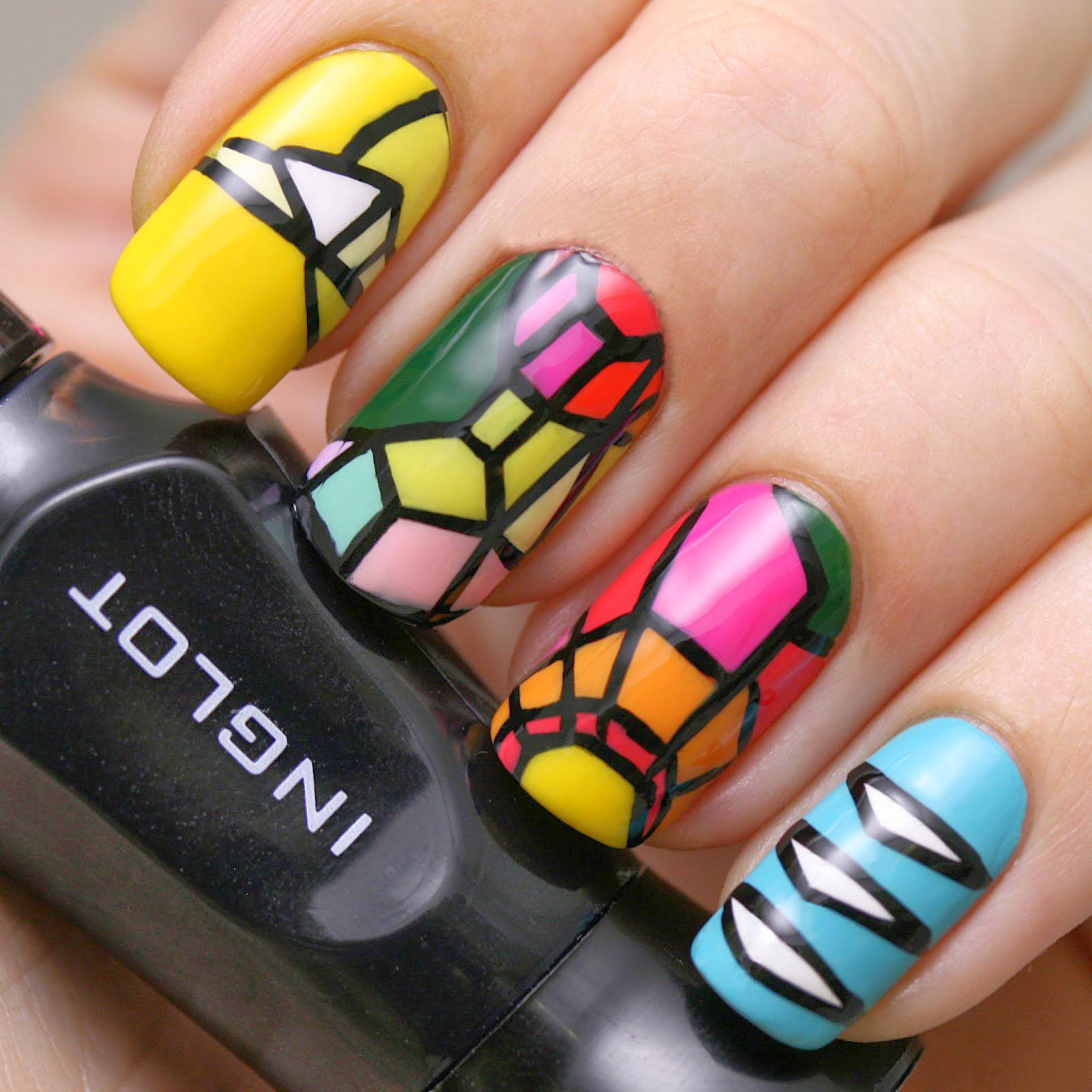 Промежутки между границами надо заполнить цветными лаками. Затем следует еще раз прорисовать линии черного цвета. После высыхания обязательно нанесите топовое покрытие. Благодаря нему маникюр будет хорошо держаться в течении длительного времени.