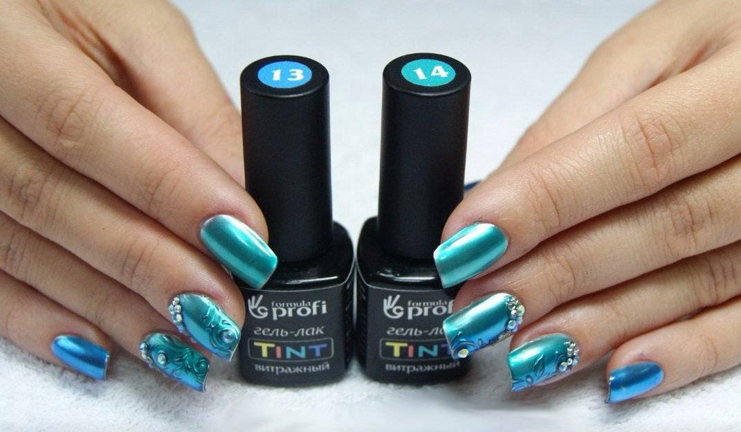 - Витражный гель лак для маникюра, который создает эффект легкости и хрупкости. Это битое стекло и аквариум.