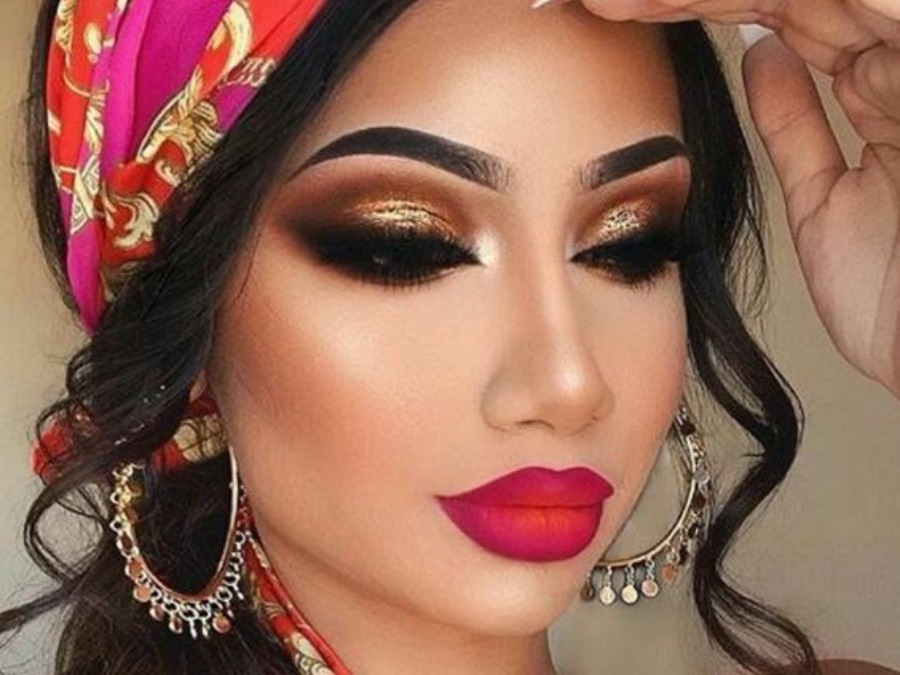 Арабский макияж глаз сочетает в себе интенсивные, сочные оттенки теней, стрелки, объемные и длинные ресницы, а также яркую помаду. Этот макияж позволит вам разгуляться. Вы можете доставать из своего арсенала стразы, блестки и камни. Все пойдет в ход.