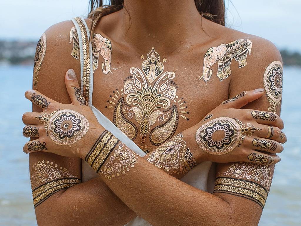- Временные золотые татуировки или флэшки смотрятся эффектно и оригинально, особенно на загорелой коже. Разнообразие орнаментов и рисунков приятно удивляет, а способ нанесения максимально прост и не займет много времени.