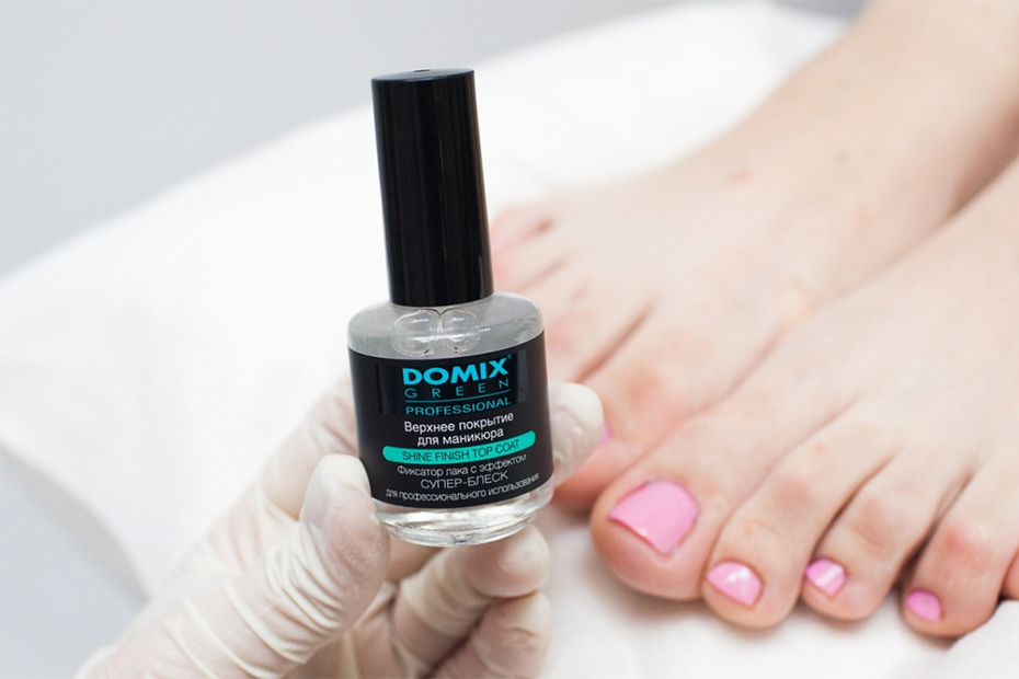 Процедура завершается нанесением на ногти средства для быстрого высыхания лака с сушащим реагентом, витамином Е и маслом инка инчи от DOMIX GREEN Professional.
