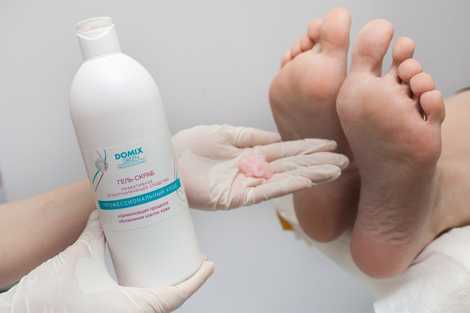 Обработка кожи стоп при помощи геля-скраба DGP – эффективного отшелушивающего средства для нормализации процессов обновления клеток. Производится массаж стоп в течение трех минут, после чего стопы ополаскиваются водой. Остатки геля-скраба нужно тщательно смыть, чтобы между пальцев не осталось абразивных частиц, которые после процедуры могут доставить клиенту неудобства при ходьбе.