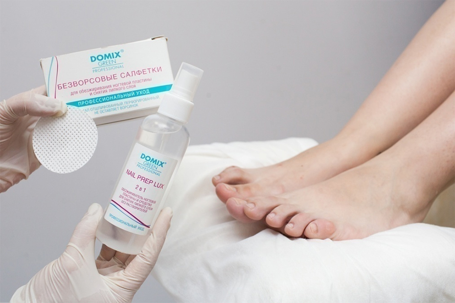 Ногти на ногах обезжириваются при помощи средства DGP NAIL PREP LUX и безворсовых салфеток.