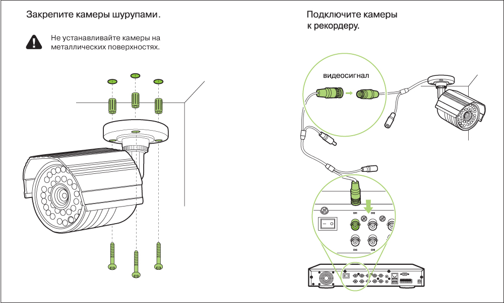 Установите камеры на максимально возможной высоте, зафиксируйте их шурупами. Угол обзора обязательно должен захватывать проблемные зоны: зал самообслуживания, кассовые участки, входы и выходы, парковки. Оборудование запрещено монтировать вблизи силовых кабелей – это может ухудшить сигнал, а также нежелательно крепить камеры на металлических поверхностях.