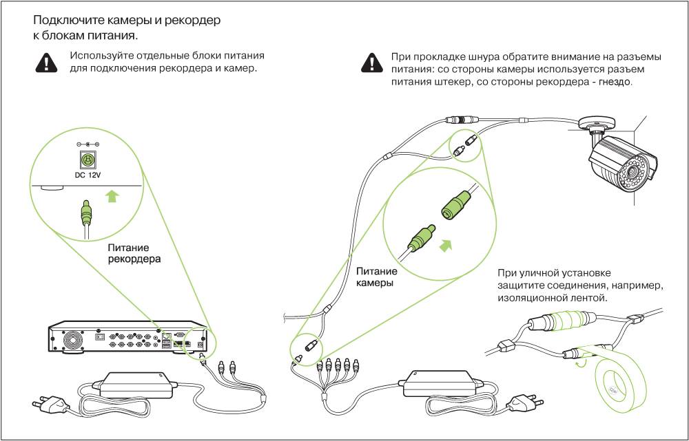 Подключите один блок питания к рекордеру, второй при помощи разветвителя из комплекта – к камерам. Соединительные шнуры уложите в гофры либо кабель-каналы. Лучше всего провести скрытый монтаж кабеля – это поможет уберечь систему от злоумышленников. Видеорекордер следует убрать в недоступное для сотрудников и покупателей помещение или ящик.