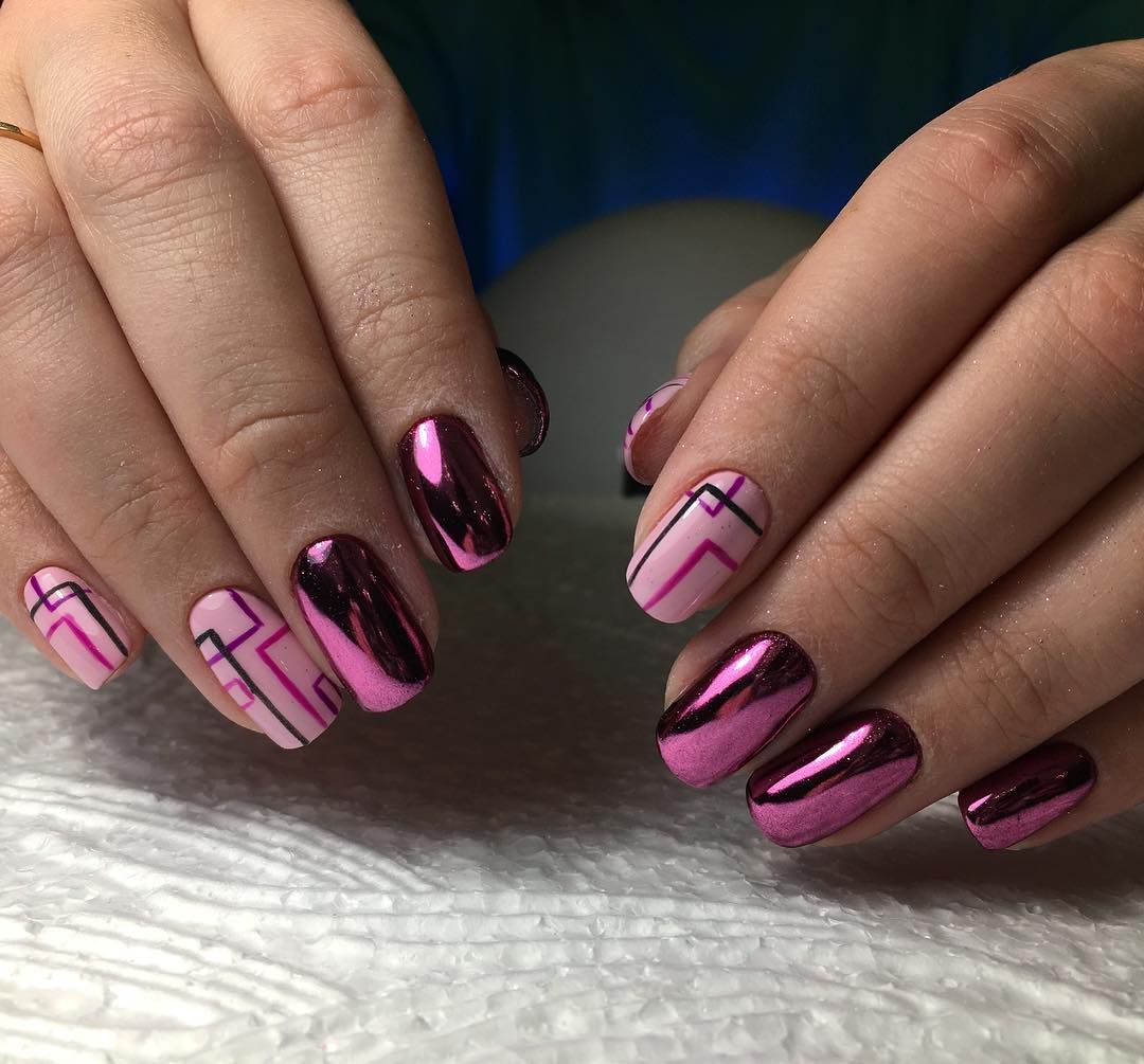 Этот дизайн популярен уже не первый сезон, но если раньше мастера использовали фольгу или специальные лаки, то сейчас применение втирок в разы упростило процесс создания зеркального маникюра и улучшила его качество.