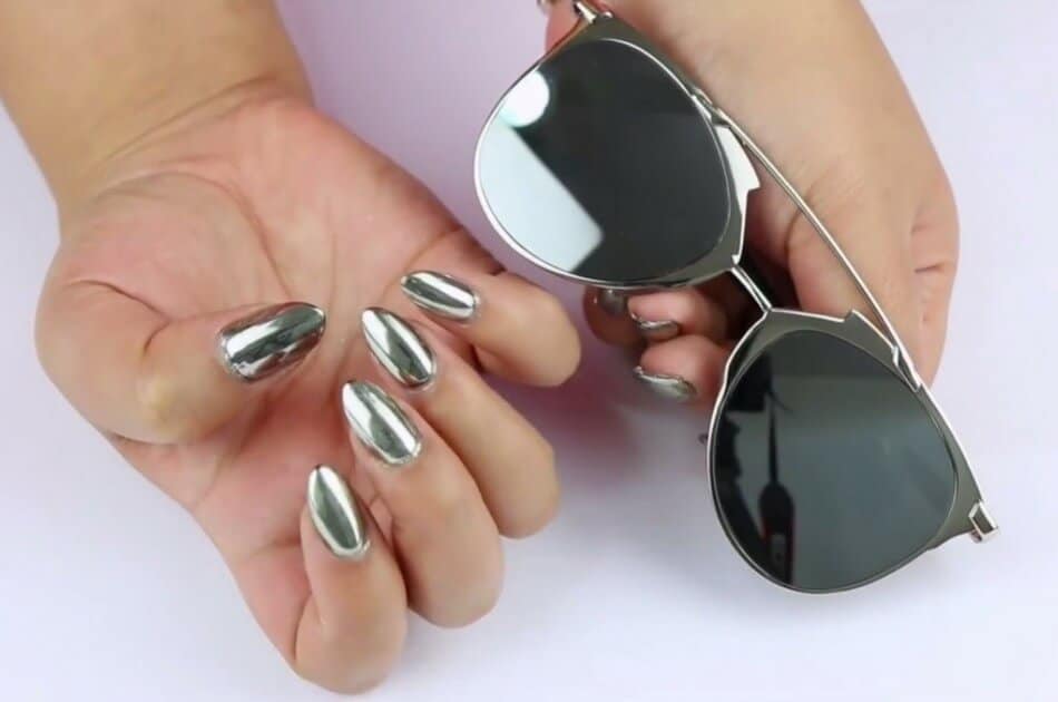 Существует пудра с оттенками серебра (ярко выраженный глянцевый эффект), перламутра, а также с хромовым блеском (приглушенный металлик). Выбирают более подходящий вариант для конкретного случая.