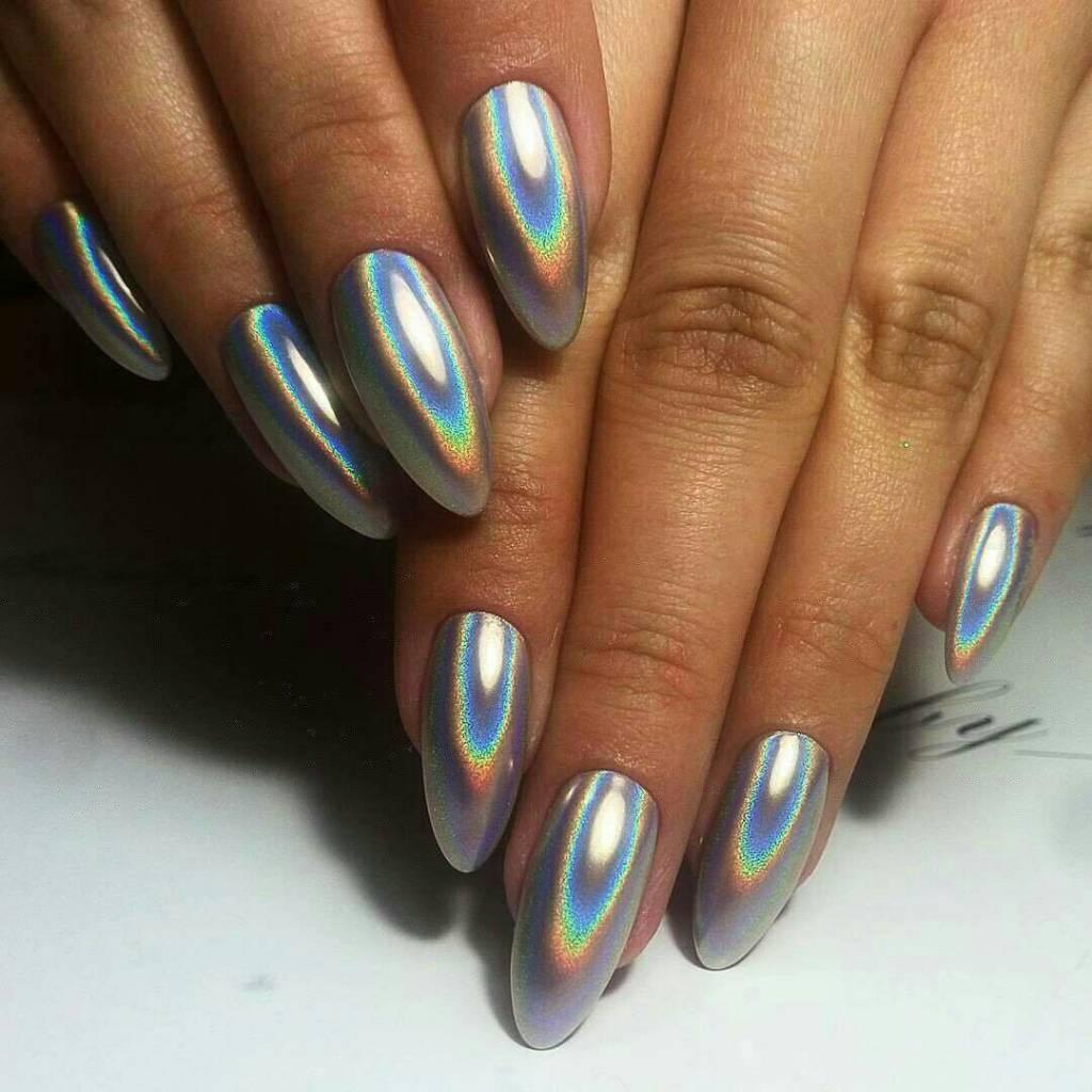 Переливы цвета голографической втирки придают ногтям особого вида. Присутствие ее в маникюре будет уместной не только для повседневного ношения, но и для торжественных случаев. Чтобы эффект порадовал, стоит покрывать ногти в 2 слоя цвета, чтобы не осталось просветов.