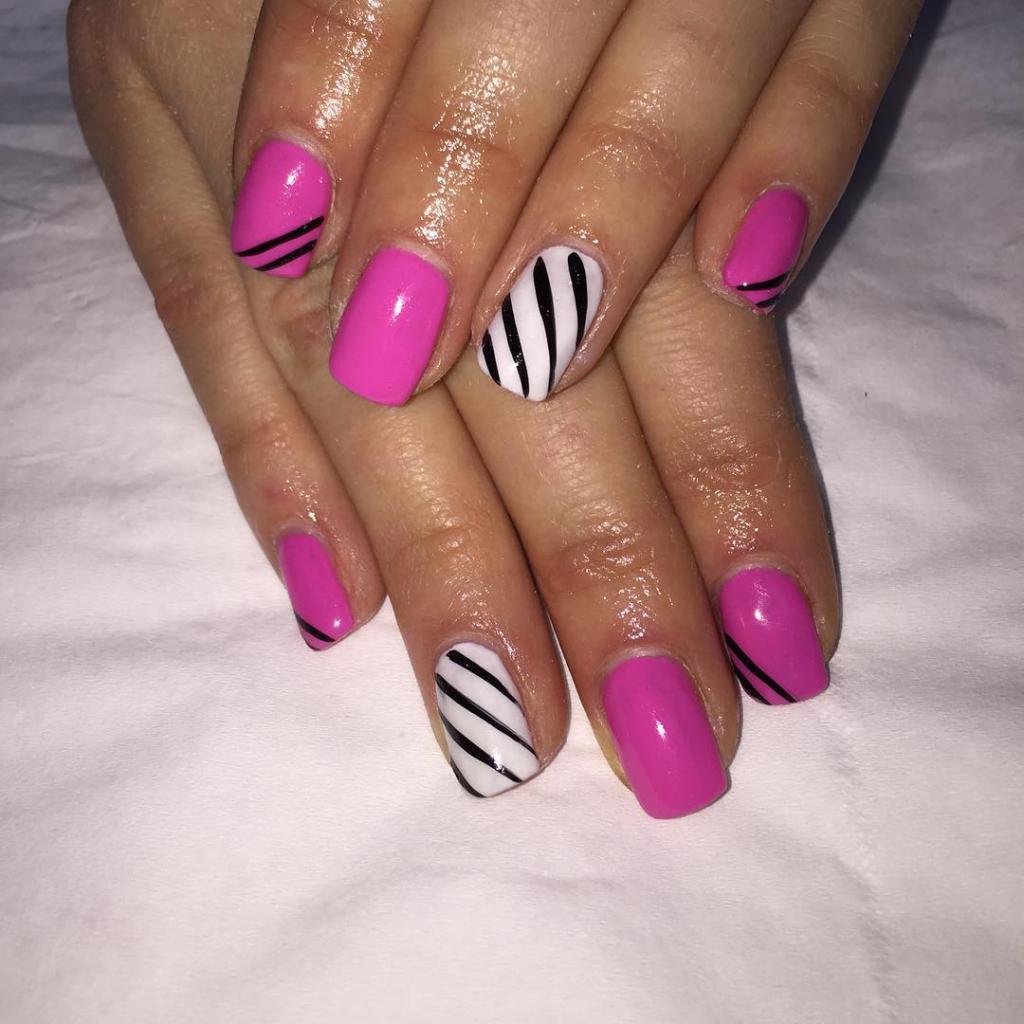 Ярко розовый маникюр отлично будут смотреться в сочетании с белыми полосками, геометрическими фигурами или маленькими точками. Также их можно отделать блестками, фольгой или камнями, сделать концы ноготков разноцветными.