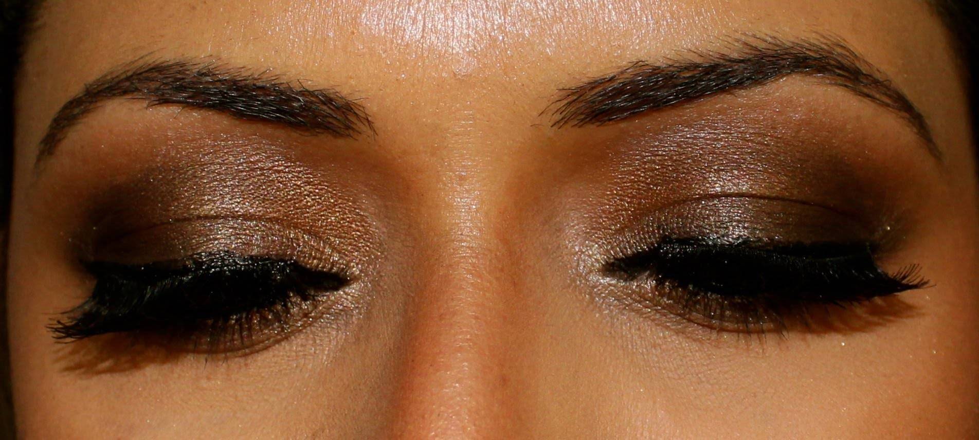 - Темноволосым девушкам: насыщенно-шоколадный, золотые, цвета шампанского и бежевые тени, чёрный или тёмно-коричневый карандаш для глаз.