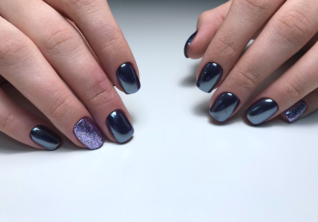Второй по популярности маникюр с втиркой – зеркальный блеск. Практически все зеркальные втирки наносятся на черный гель-лак для достижения максимального эффекта