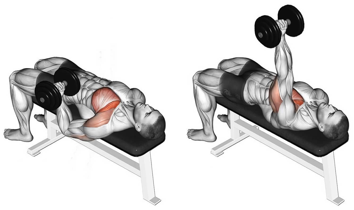 Возьмите гантели прямым хватом и лягте на лавку. Выпрямите руки, поднимая гантели над головой. Теперь согните руки в локтях, опуская гантели к груди. При этом локти двигаются в стороны, сгибаясь под прямым углом. Базовое упражнение с гантелями для мужчин прорабатывает большие пекторальные мышцы, формируя выраженный рельеф в области груди. Обязательное упражнение на грудные мышцы для мужчин.