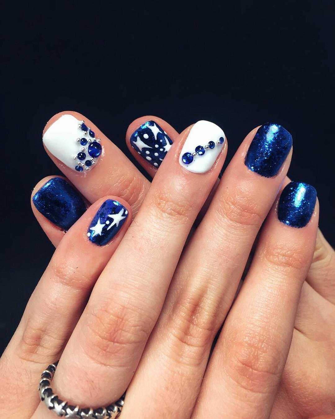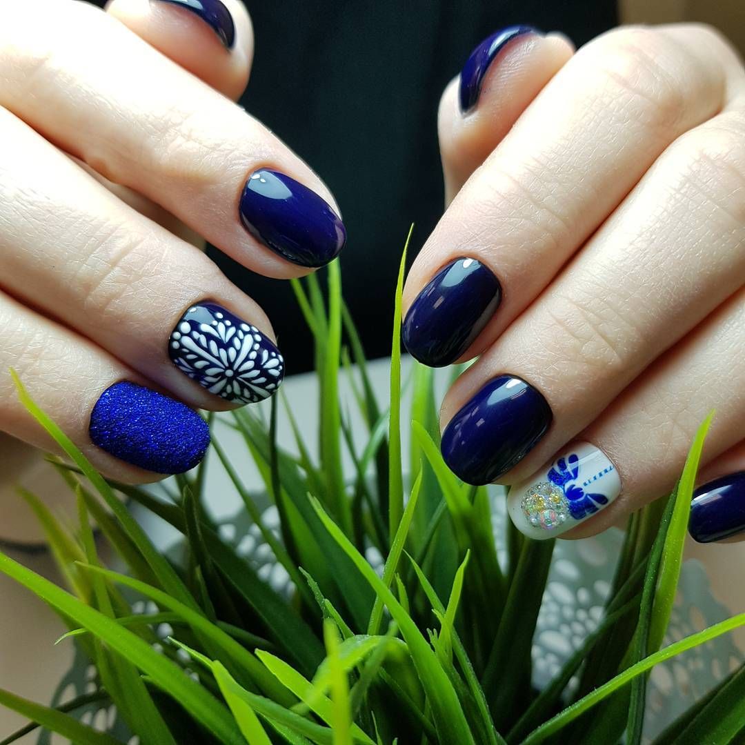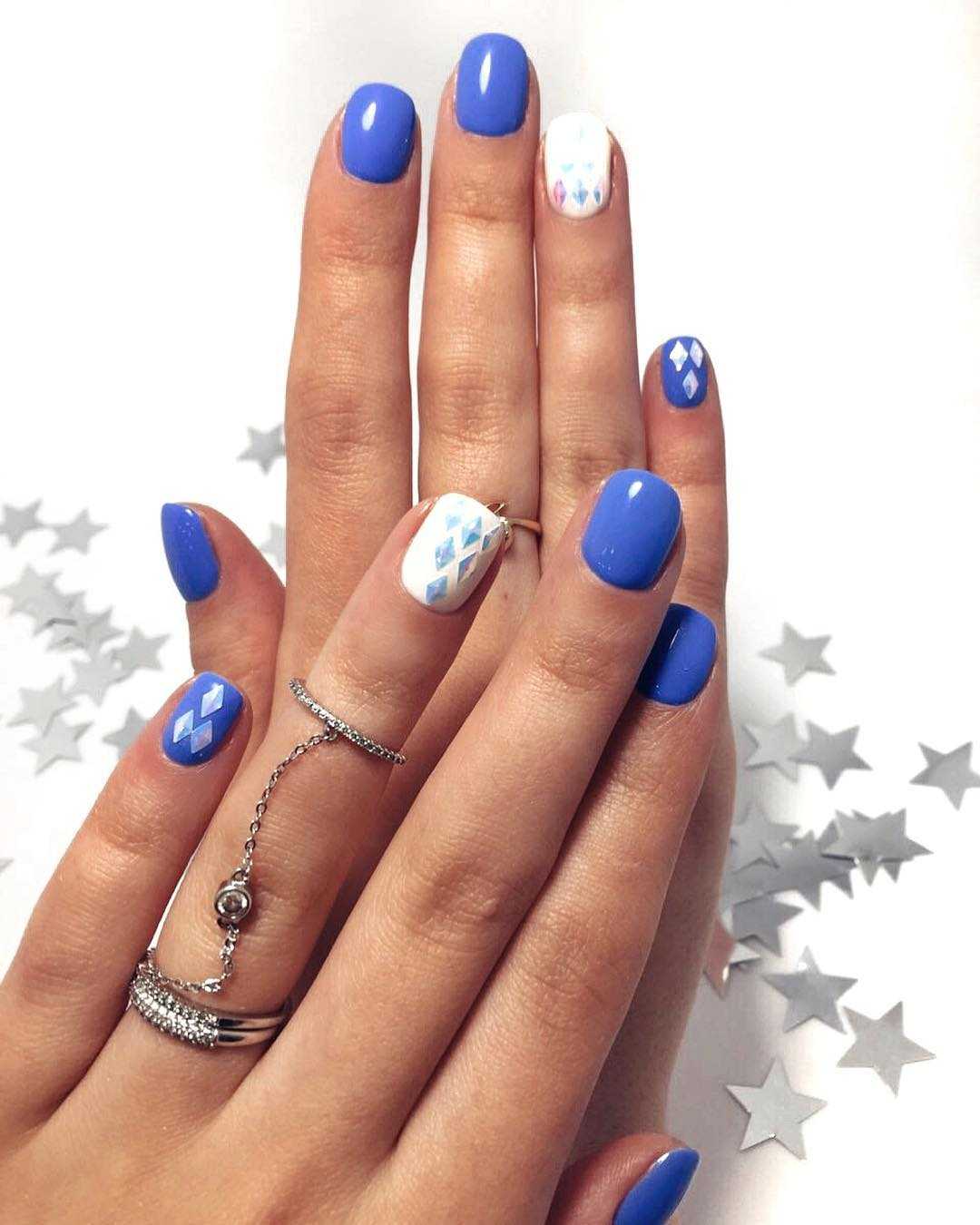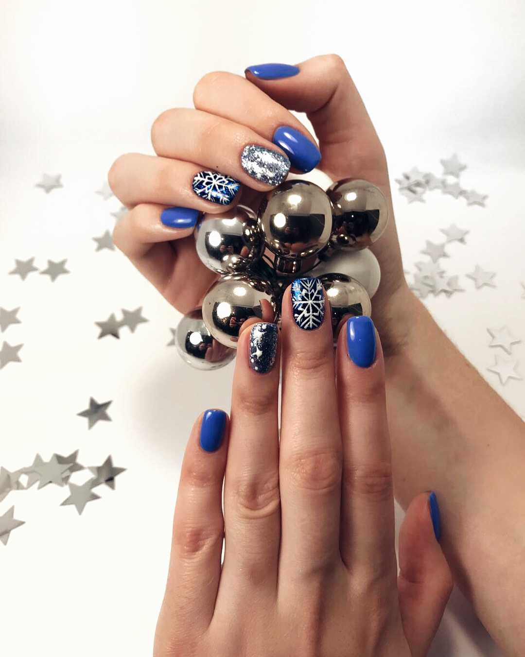 Оттенки синего великолепно сочетаются между собой и с серебристыми, золотистыми блестками, создавая прекрасную композицию для оформления праздничного зимнего маникюра 2023.