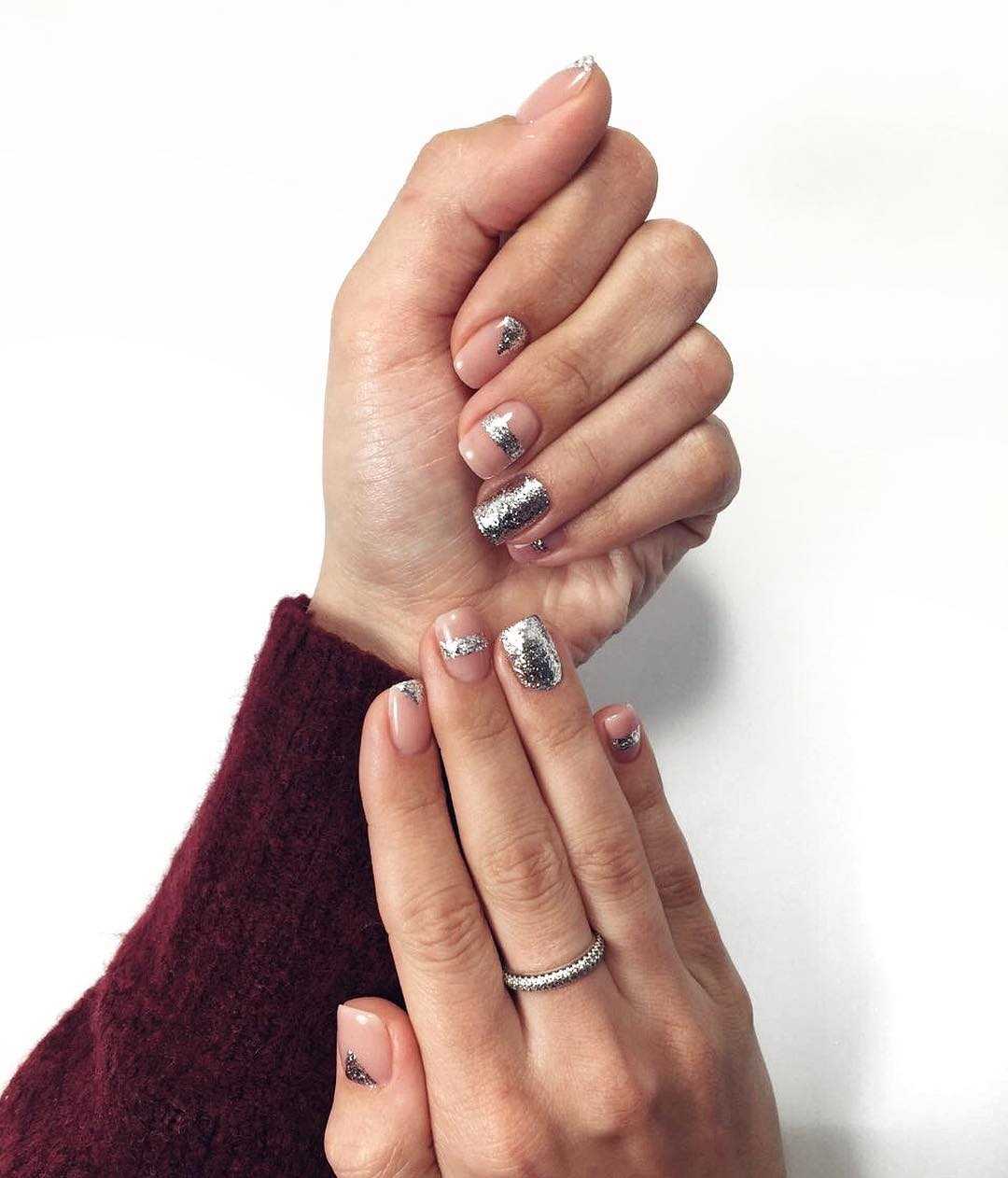 Серебристый – популярный зимний цвет, символизирующий блеск снега, мороз и сосульки. Без него не обходится ни один праздничный маникюр. Серебро можно использовать со стразами, фольгой, перламутром камефубуки и другими украшениями.