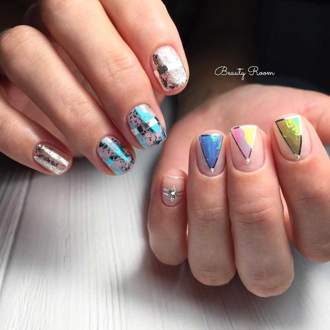 Для декора используются блестки и стразы больших, маленьких размеров. Простые варианты маникюра переплетаются со сложными техниками. Рассмотрим, оригинальные идеи.