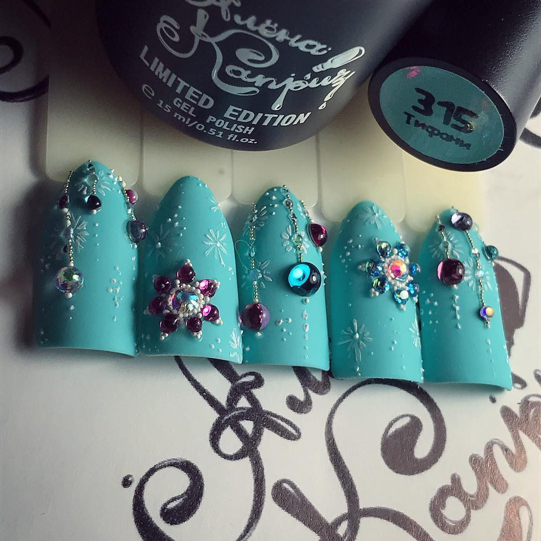 Неоднозначный, благородный цвет, который лучше всего смотрится сам по себе, создавая монохроматический зимний маникюр. Отлично смотрится с глиттером, осколками стекла и эффектом “кошачьего глаза”, объемными матовыми узорами того же цвета, золотыми и серебряными линиями.