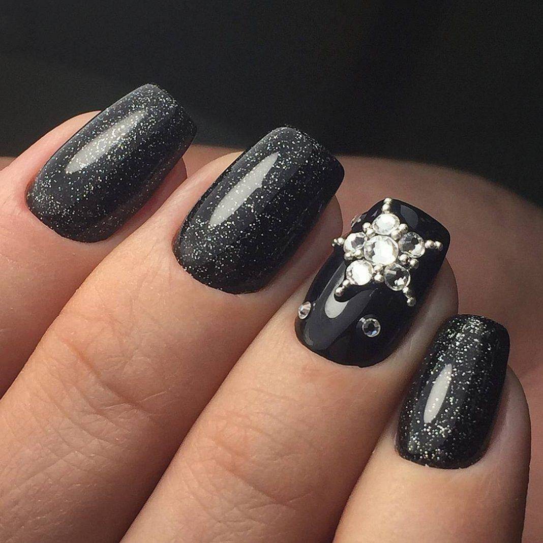 Черный лак для ногтей позволяет сочетать необычные оттенки и элементы декора. Белые ногти и узоры создадут контраст, а золотистый глиттер добавит сияния.