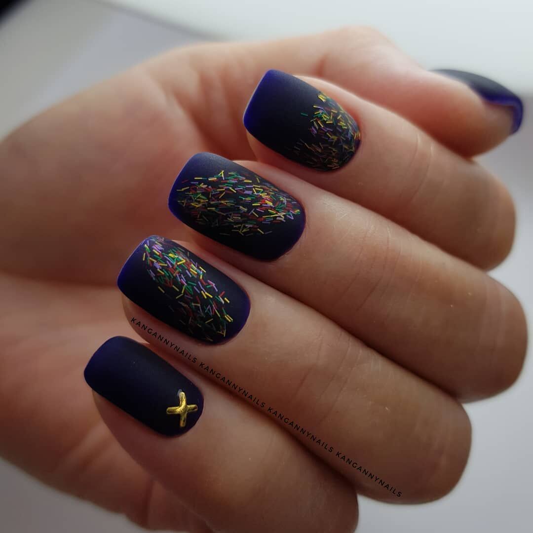 Дополнить дизайн ногтей зима 2022-2023 можно фольгой, втиркой, камифубуки, стразами, блестками, которые будут напоминать сияющие звездочки или конфетти.