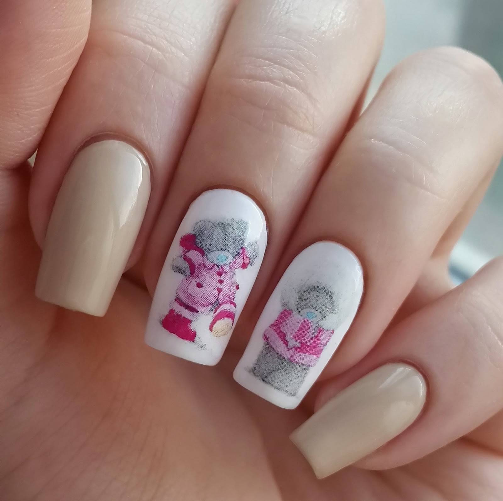 Такие изображения свойственно выполнять позитивным и жизнерадостным девушкам. К самым распространенным рисункам относятся Микки Маус, Hello Kitty, Винни Пух или Пяточек. Такой маникюр способен подчеркнуть чувство юмора и скромность девушки.