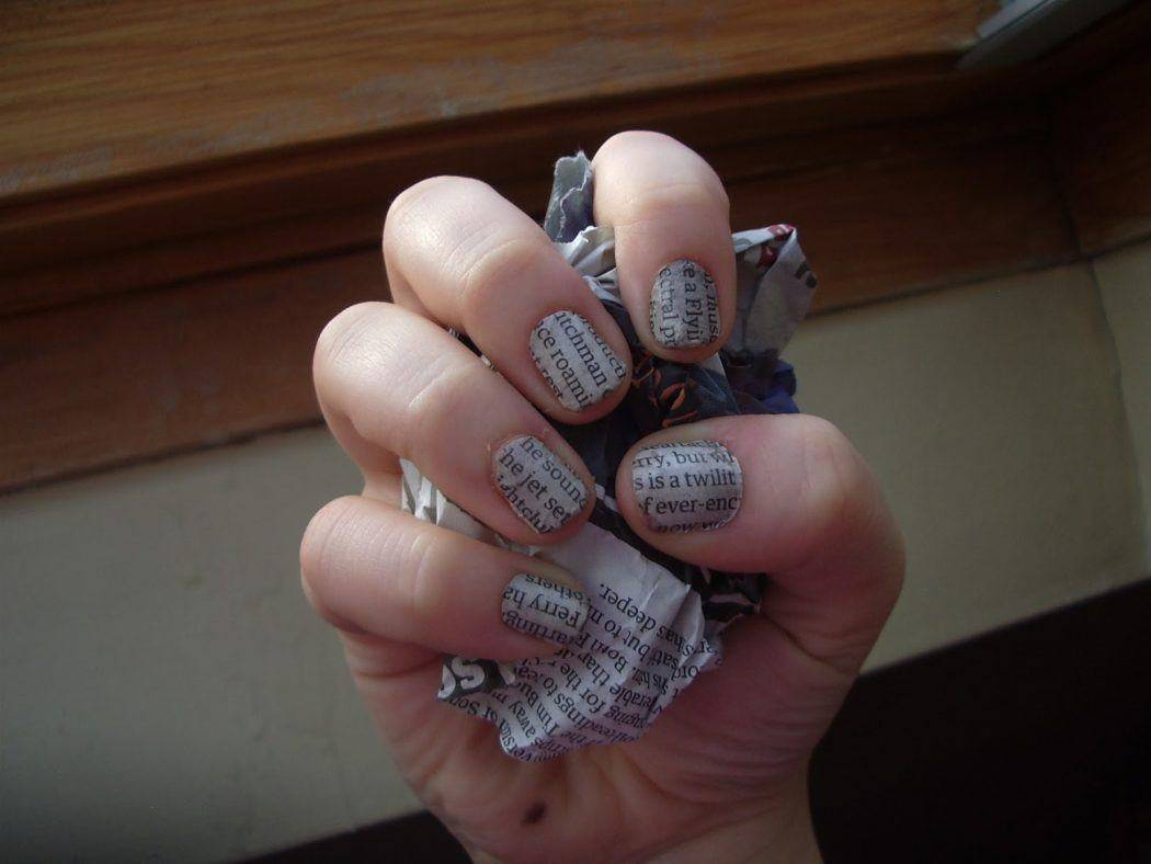 Второй, более бюджетный вариант – использовать простую газету. С ее помощью можно сделать оттиск с текстом или же нанести на ноготок небольшой отрезок. Такой маникюр сможет сделать даже новичок, но перед нанесением рекомендуем немного потренироваться.