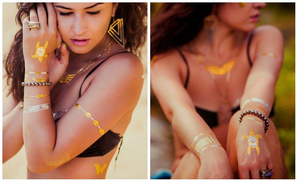Из нового в флеш-тату можно назвать золотую татуировку на волосах. Правда она хорошо будет держаться только на прямых волосах.