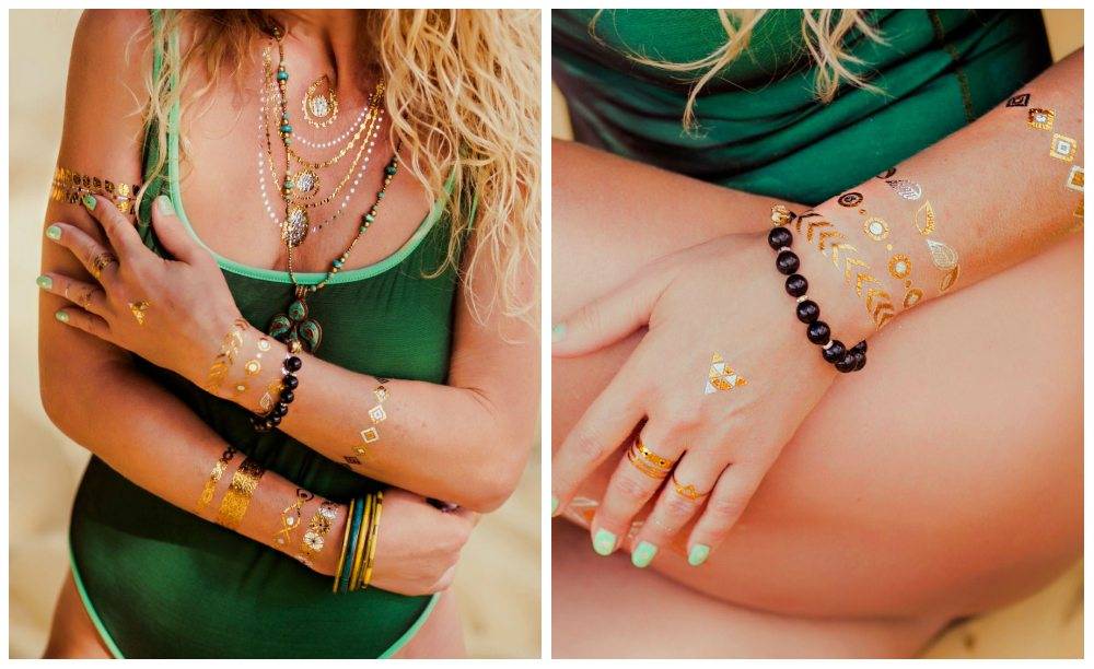 Для пляжного отдыха можно использовать золотые наколки в виде змеек на ногах, руках. Полоски, дублирующие лямки одежды, красивые картинки на видных участках бюста.
